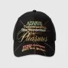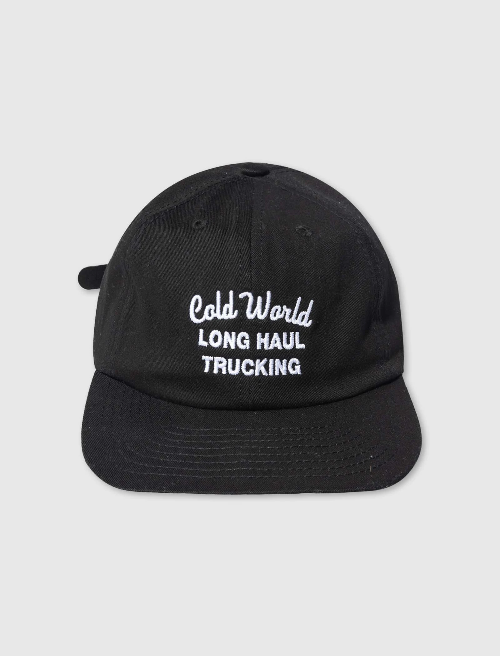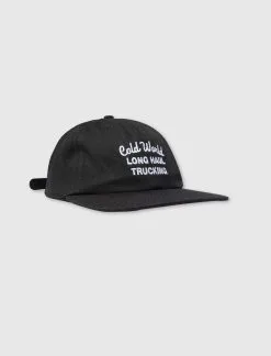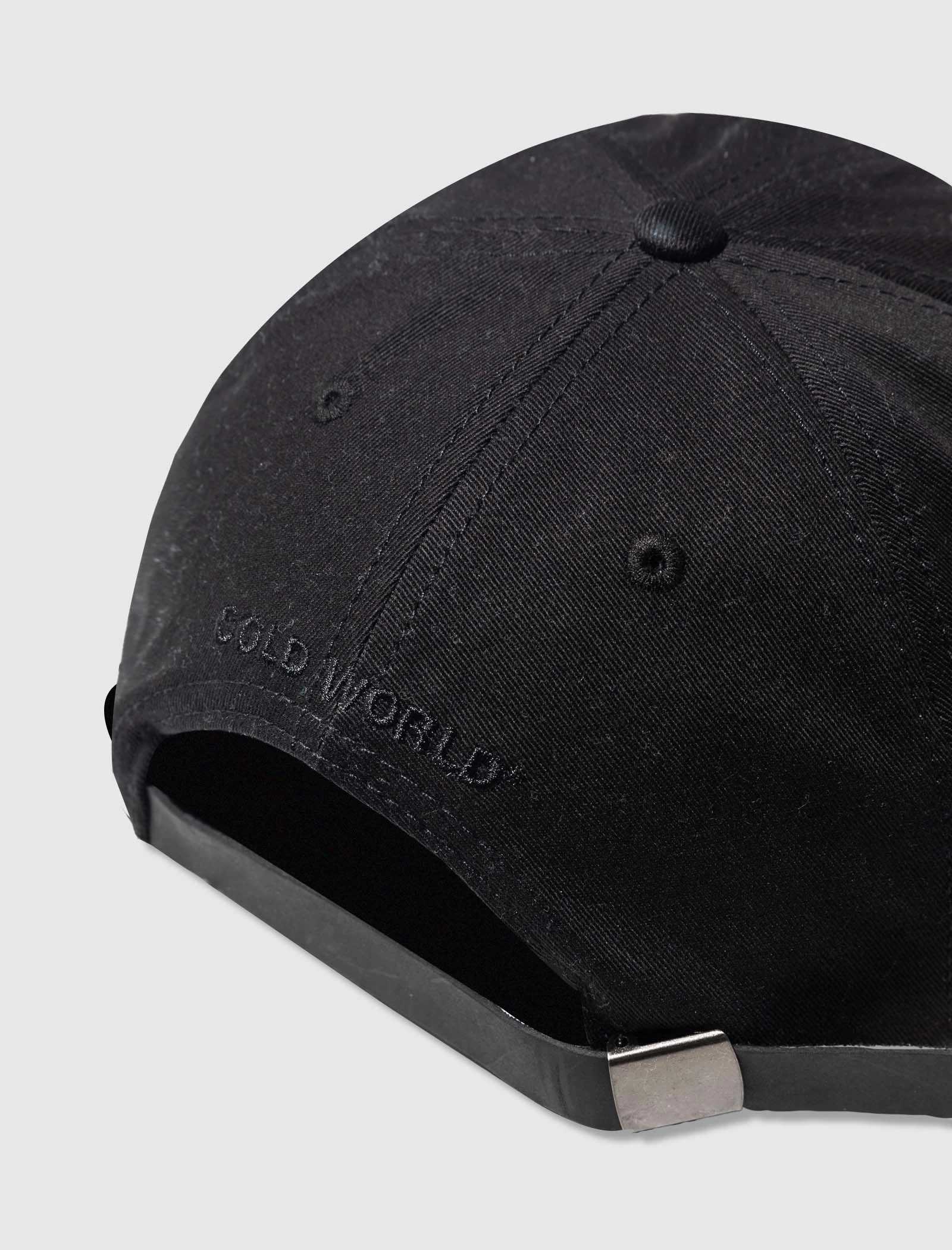 Unstructured hat. Six-panels. Embroidered logo text and text at front. Straight brim. Adjustable leather strap at back. – 100% Cotton SKU: CWD9-HAT01-BLK