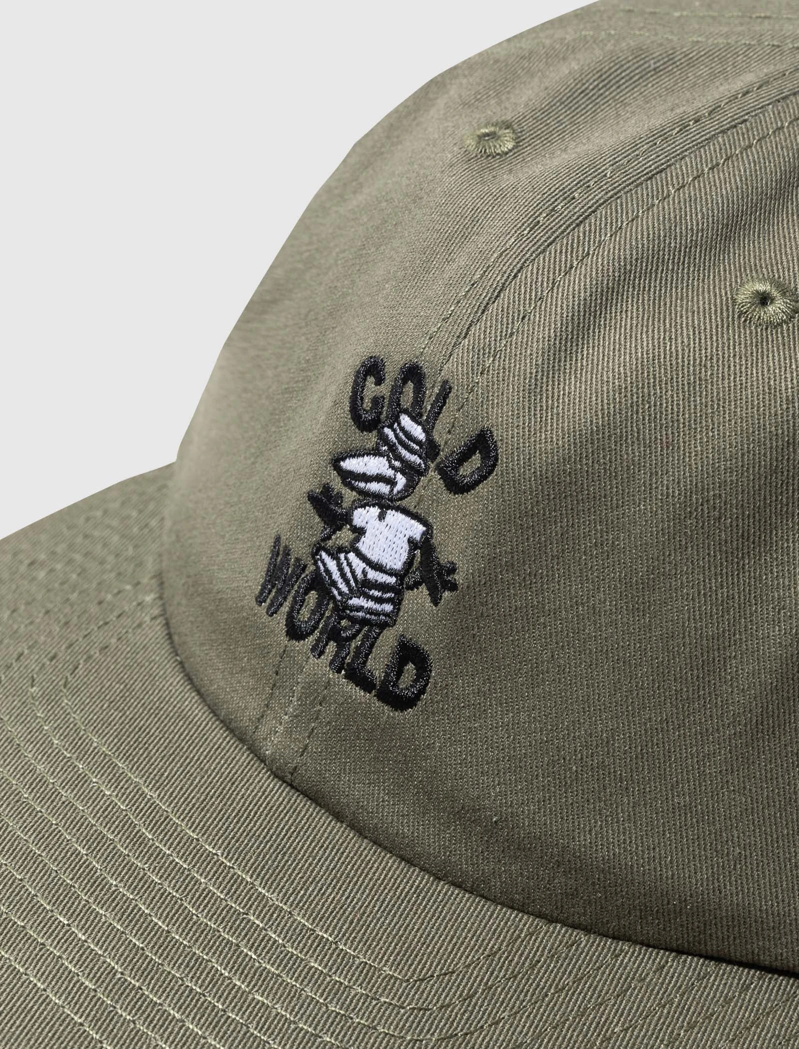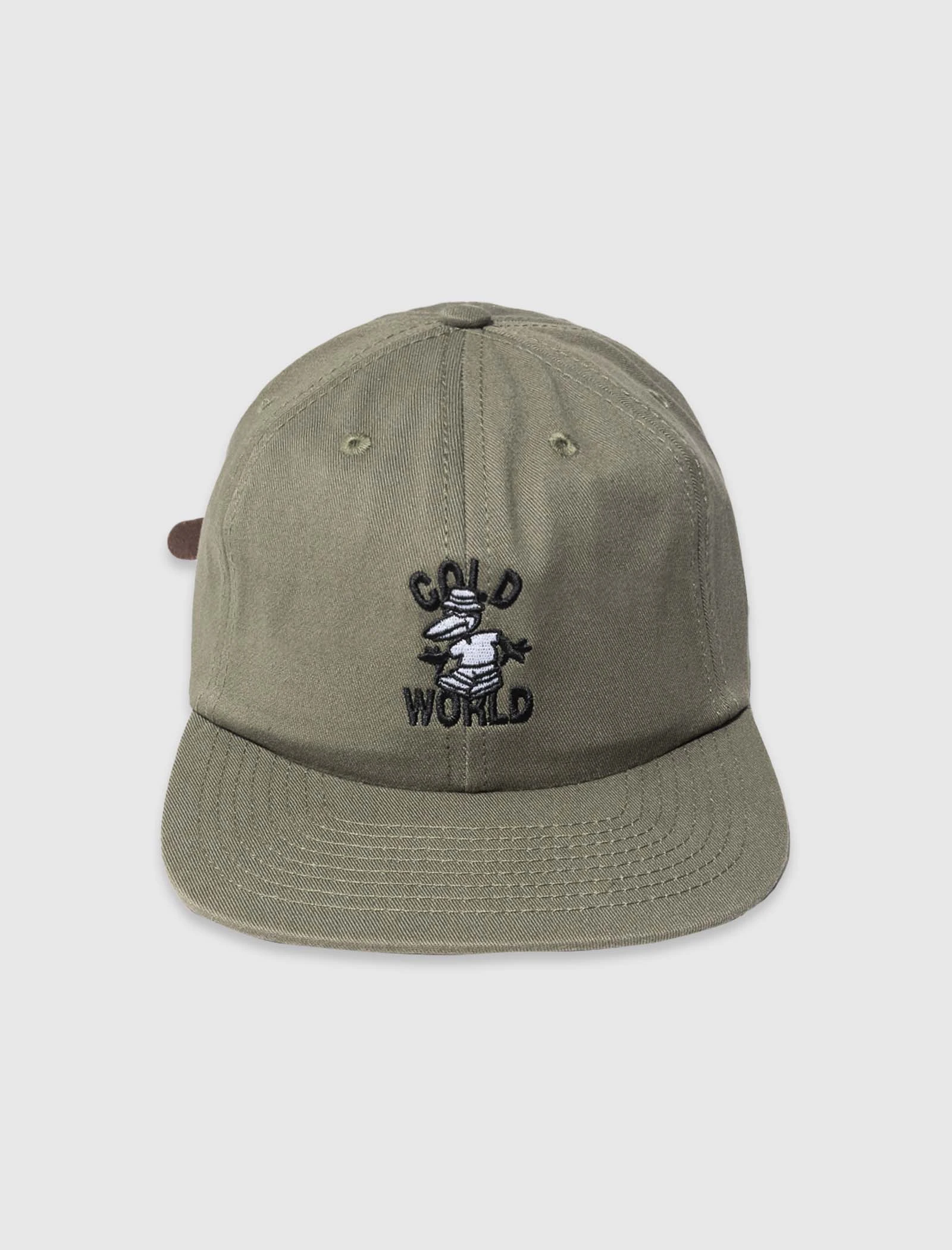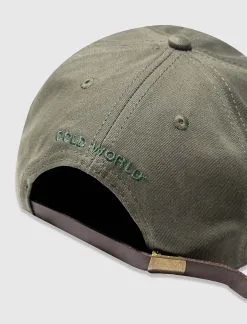 Unstructured hat. Six-panels. Straight brim. Embroidered logo text at front and back. Embroidered graphic at front. Adjustable leather strap at back. – 100% Cotton SKU: CWD9-HAT03-OLV