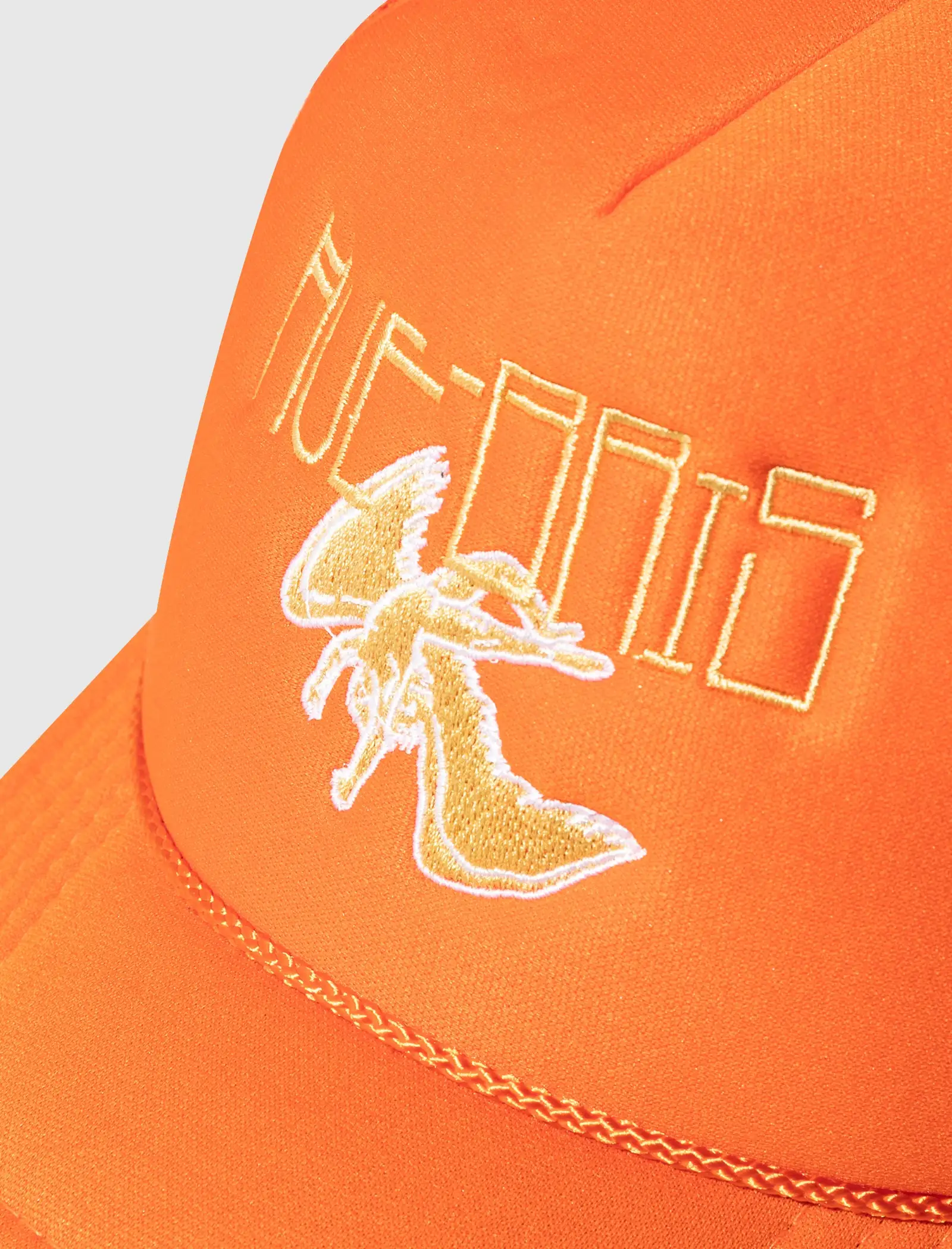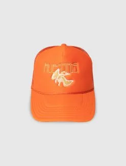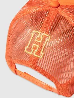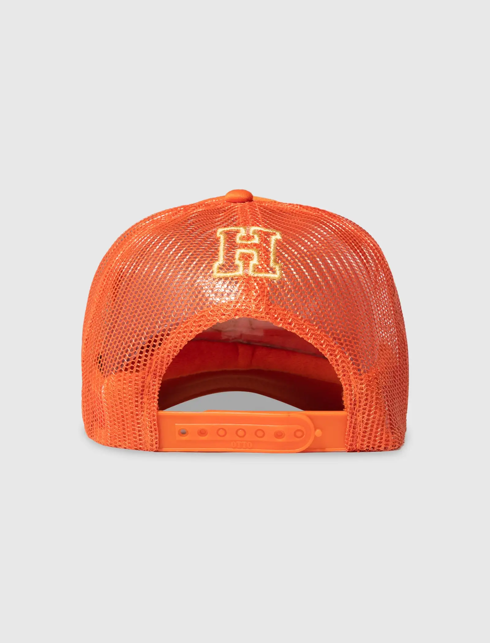 Trucker hat. Curved brim. Embroidered logo and text at front and back. Mesh detail. Adjustable snapback. – 100% Polyester SKU: HOH-CC-TRUCKER2-ORG