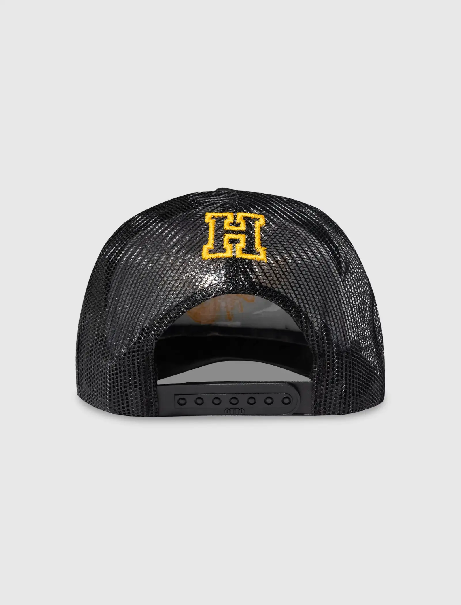 Trucker hat. Curved brim. Embroidered logo and logo text at front and back. – 100% Polyester SKU: HOH-CC-TRUCKER1-BLKXWHT