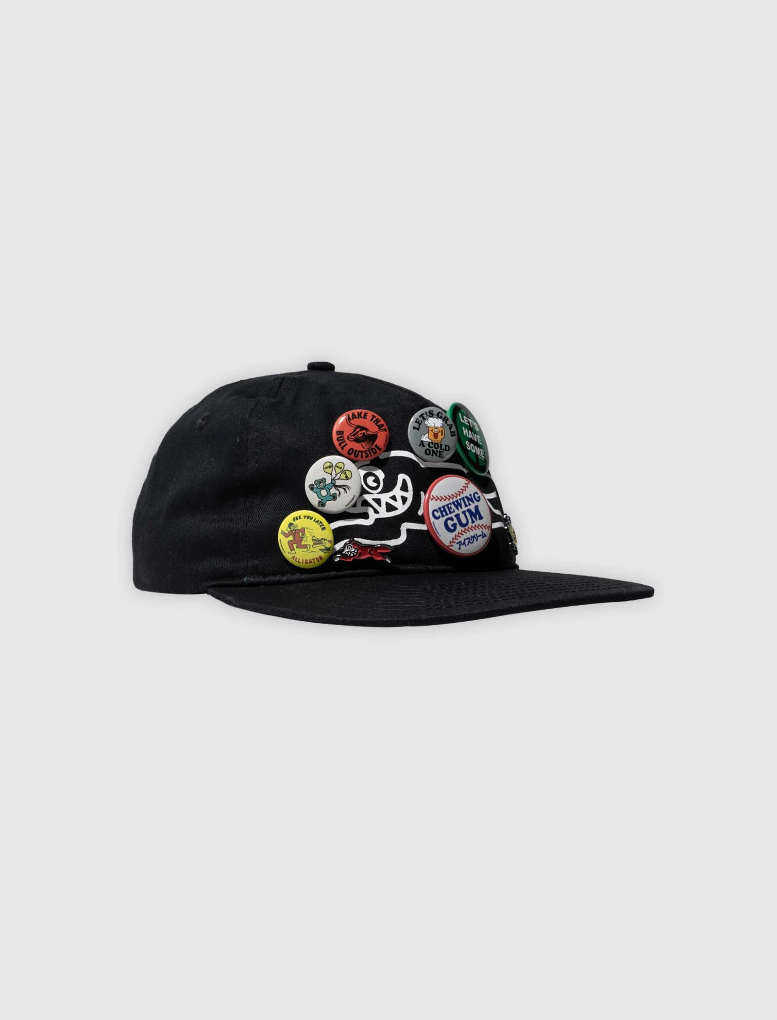 Canvas trucker hat. Graphic logo printed on the front. Pins all throughout the front. Curved brim. Adjustable canvas back strap with metal buckle. – Cotton SKU: 411-9802-BLK