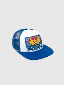 Trucker hat. Graphic printed on the front. Flat brim. Nylon mesh back panel. Snap back closure. – Polyester SKU: 421-6801-BLU