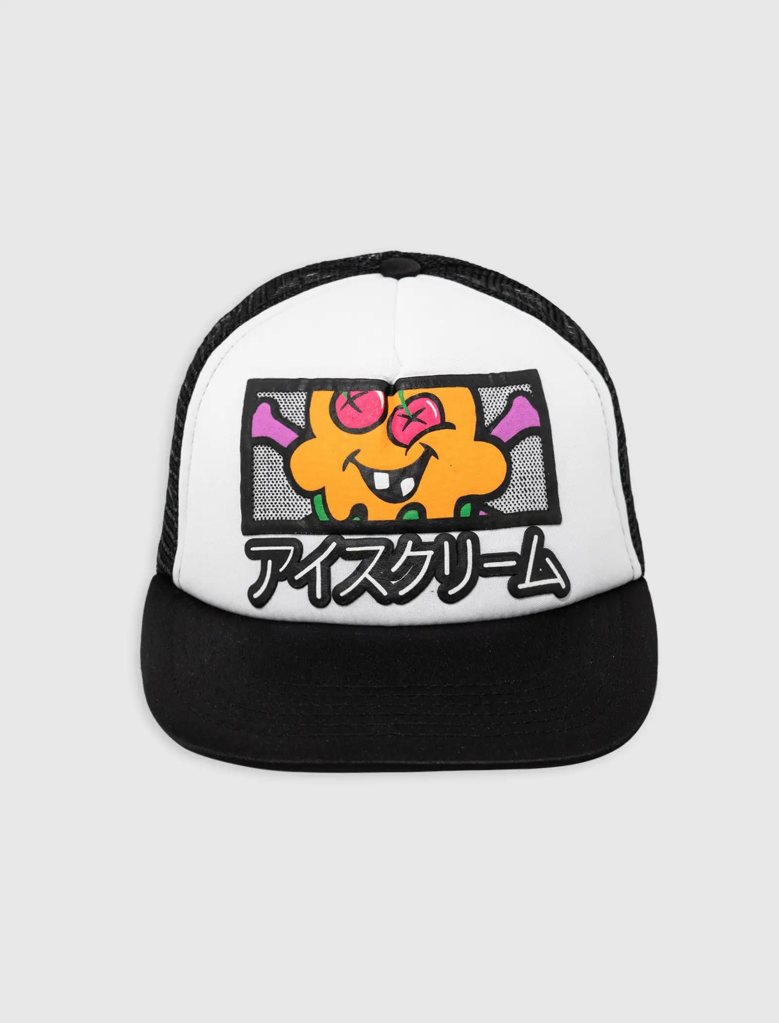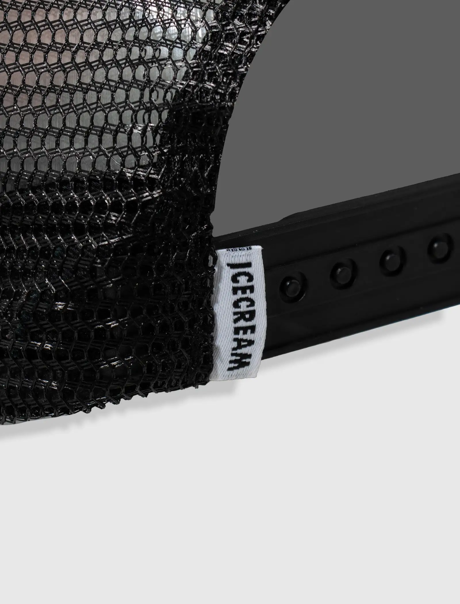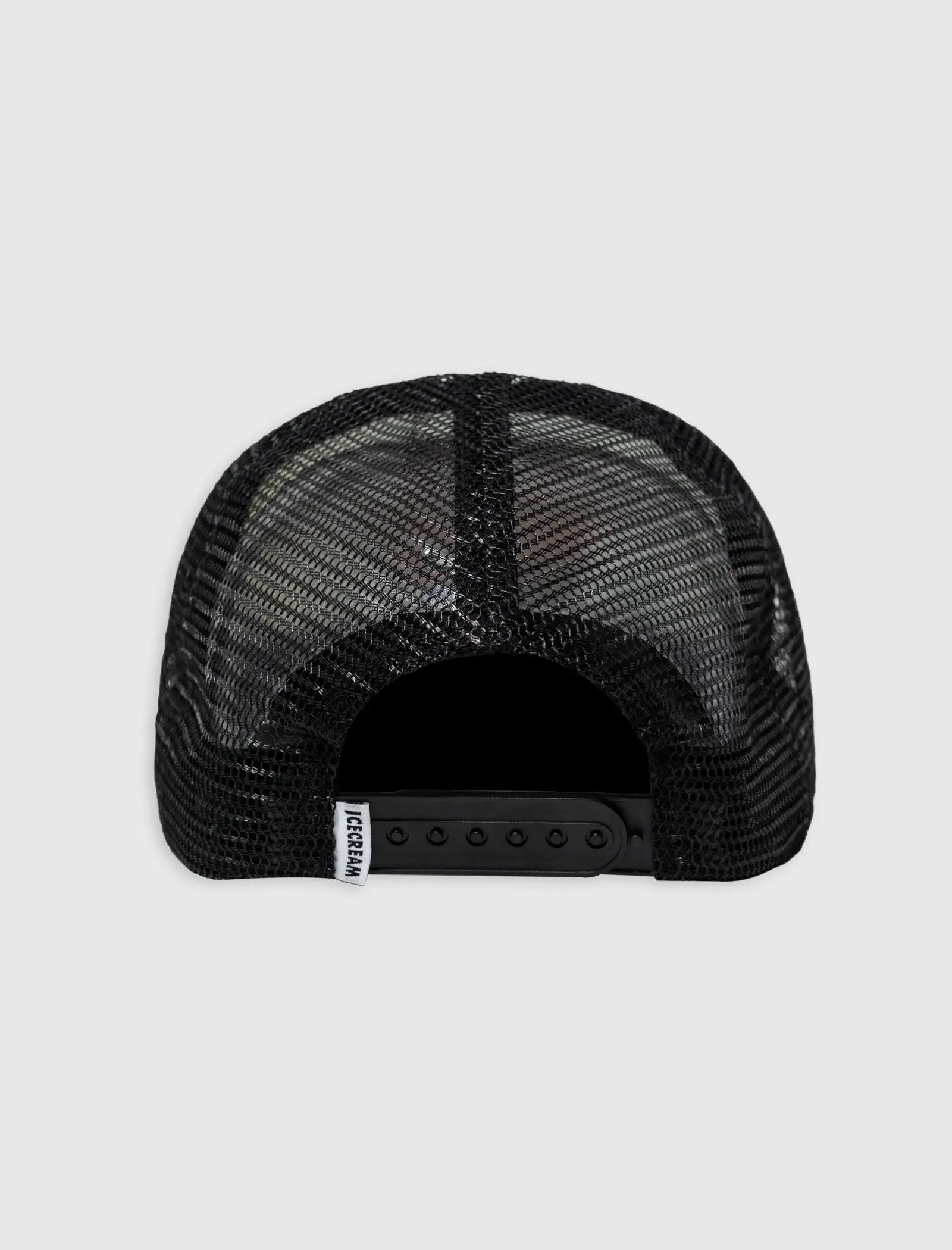 Trucker hat. Graphic printed on the front. Flat brim. Nylon mesh back panel. Snap back closure. – Polyester SKU: 421-6801-BLK