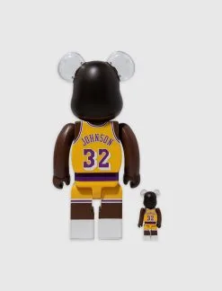 Magic Johnson 400% and 100% Be@rbrick set. Vinyl figures. 400% figure is approximately 11 inches tall, and 100% figure is approximately 3 inches tall. Graphic printed all throughout. – Vinyl SKU: 4530956581033